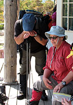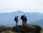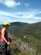 At around 3300' we encountered the first patches of snow. It really wasn't until we hit the Garfield Ridge trail that there was any sustained snow, but even then it was nothing you couldn't handle with bare boots. Meri and Nancy had long since sped ahead of me, so I found Pat and Teejay just before the hut and finished with them. We dumped our food loads on one of the tables, grabbed low altitude bunks, and changed clothes as appropriate. After a rest and some porch silliness, we looked around for something else to do that afternoon. Meri, Nancy, and I decided to head up to Galehead and then hang out on the view. It only takes 15 minutes to hit the uneventful summit of Galehead, so we quickly dropped down to the outlook where we practiced lounging. After a little while MEB showed up and hung with us for an extended lounge.