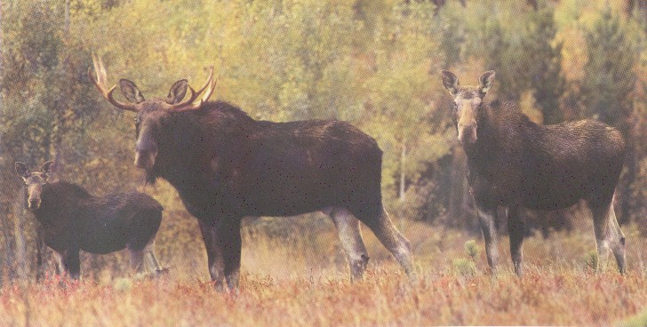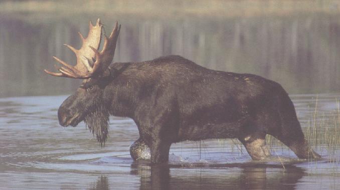 Swamps and lakes are a favorite place for the moose, where they feed on aquatic vegitation as well as shoots of willows, maples, and birches. In the summer they are usually solitary but during winter months they often gather in herds. Their long legs allow them to travel through deep snow and swamps that other animals cannot navigate.